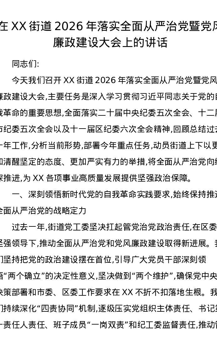 在XX街道2026年落实全面从严治党暨党风廉政建设大会上的讲话