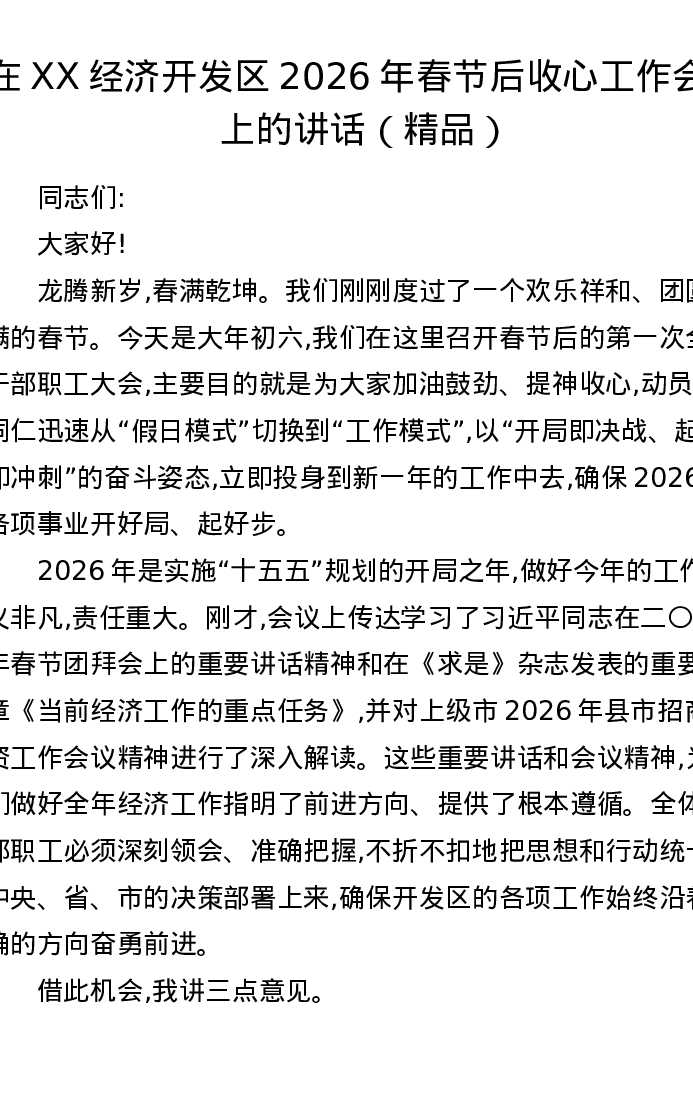 在XX经济开发区2026年春节后收心工作会议上的讲话