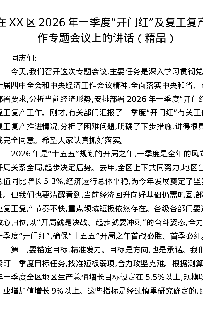 在XX区2026年一季度开门红及复工复产工作专题会议上的讲话