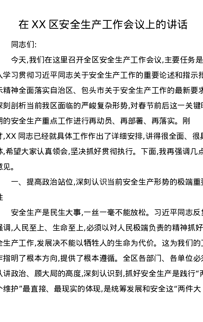 在XX区安全生产工作会议上的讲话
