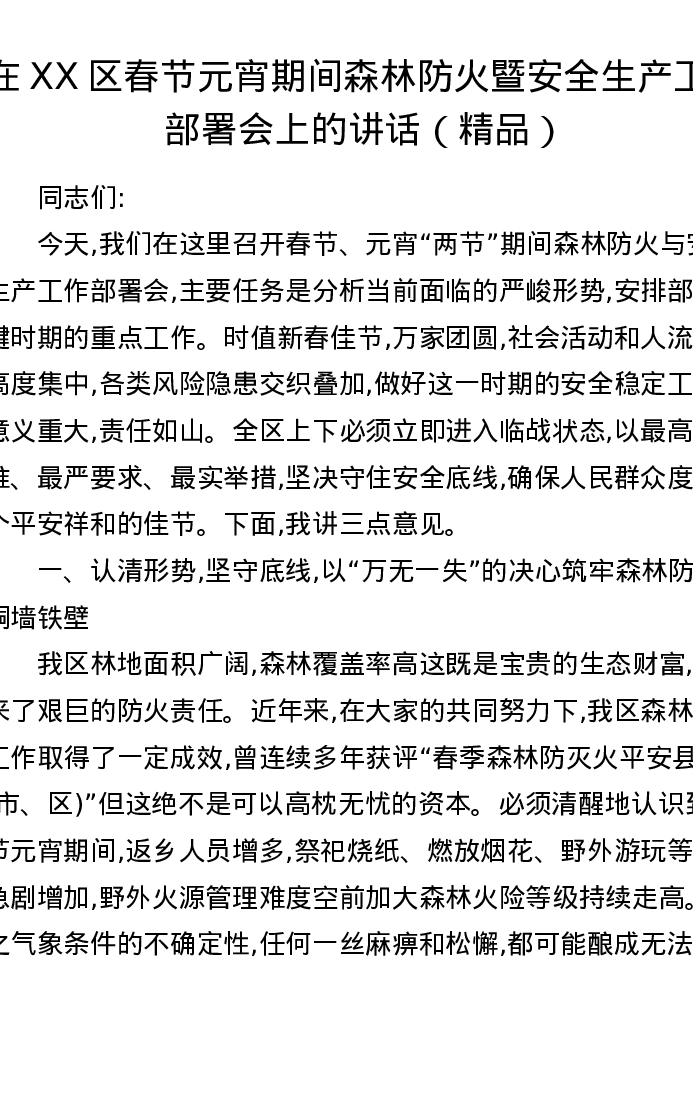在XX区春节元宵期间森林防火暨安全生产工作部署会上的讲话