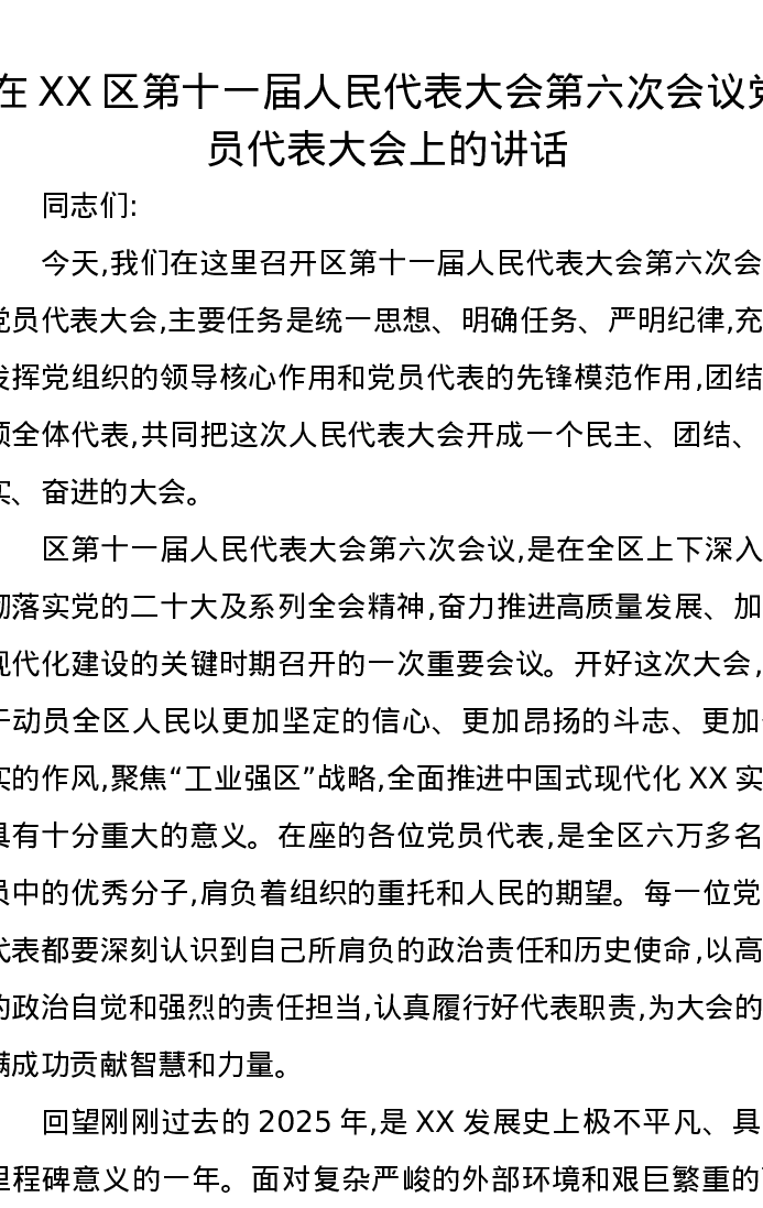 在XX区第十一届人民代表大会第六次会议党员代表大会上的讲话
