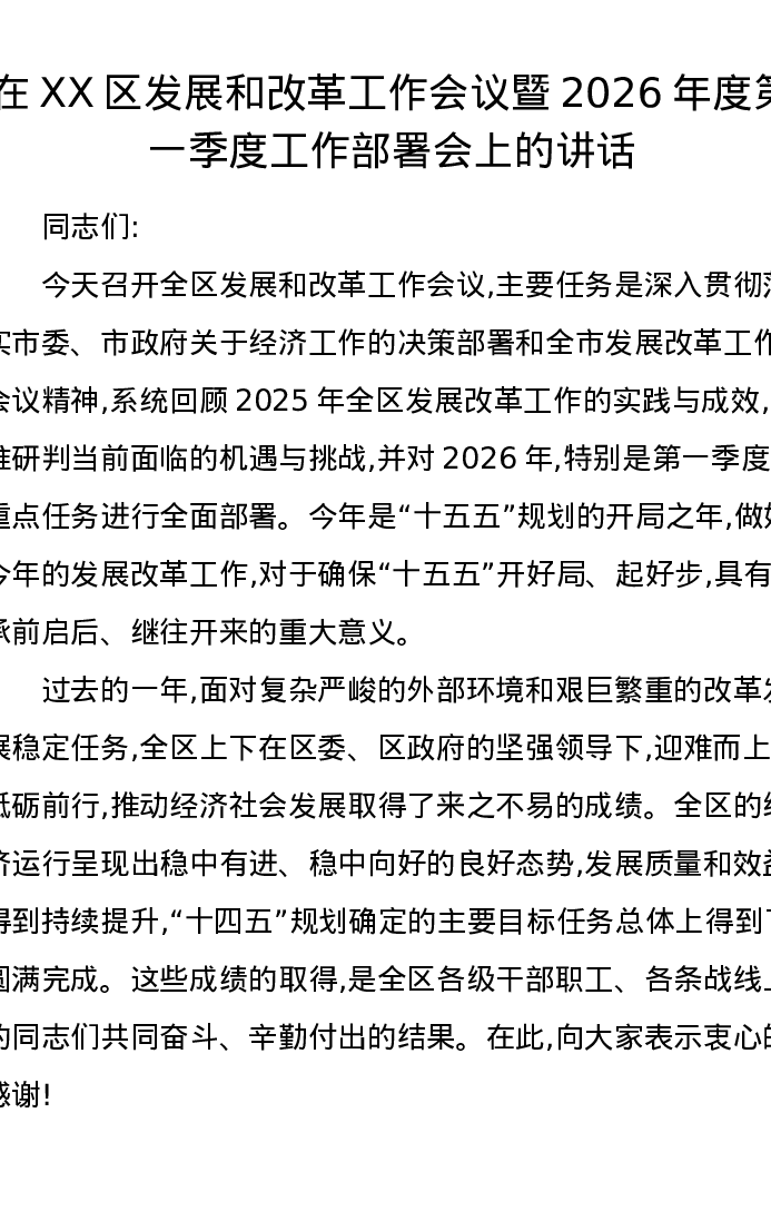 在XX区发展和改革工作会议暨2026年度第一季度工作部署会上的讲话