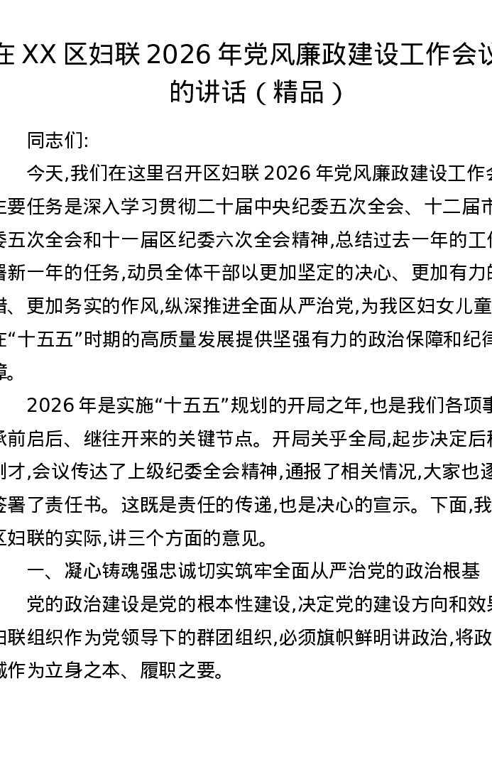 在XX区妇联2026年党风廉政建设工作会议上的讲话