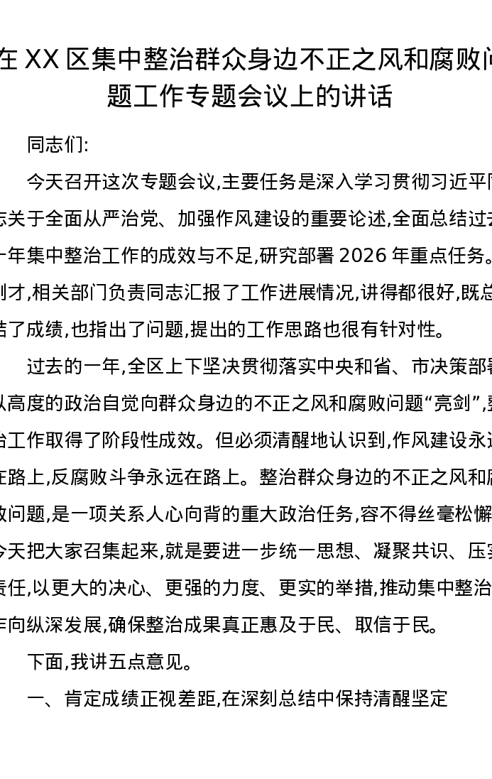 在XX区集中整治群众身边不正之风和腐败问题工作专题会议上的讲话