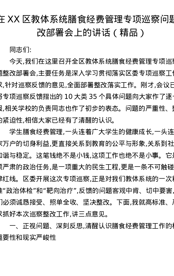 在XX区教体系统膳食经费管理专项巡察问题整改部署会上的讲话