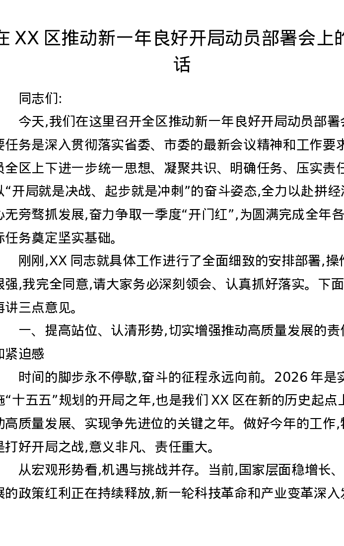 在XX区推动新一年良好开局动员部署会上的讲话