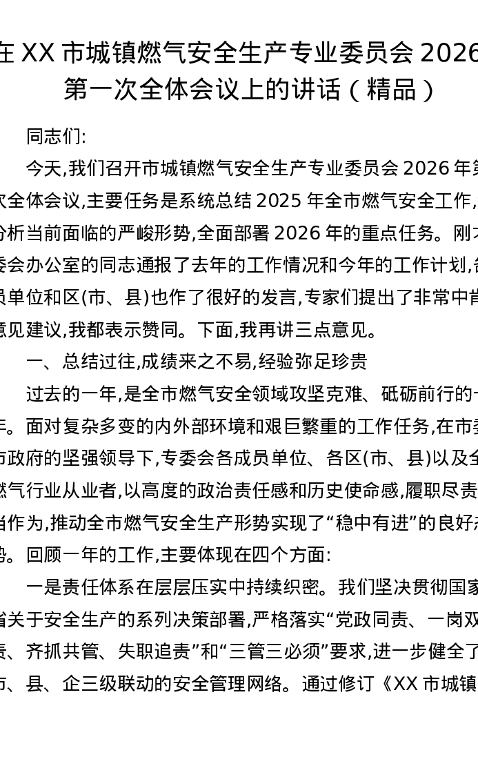 在XX市城镇燃气安全生产专业委员会2026年第一次全体会议上的讲话