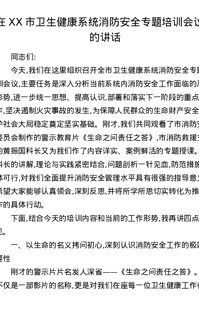 在XX市卫生健康系统消防安全专题培训会议上的讲话
