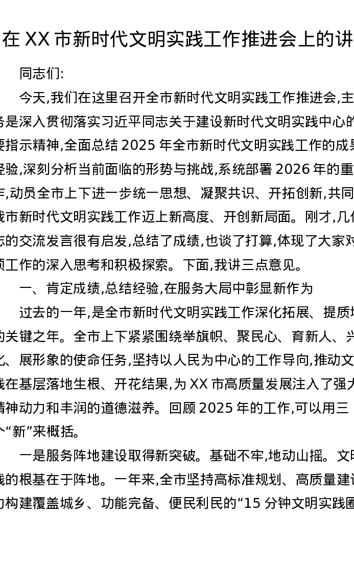 在XX市新时代文明实践工作推进会上的讲话