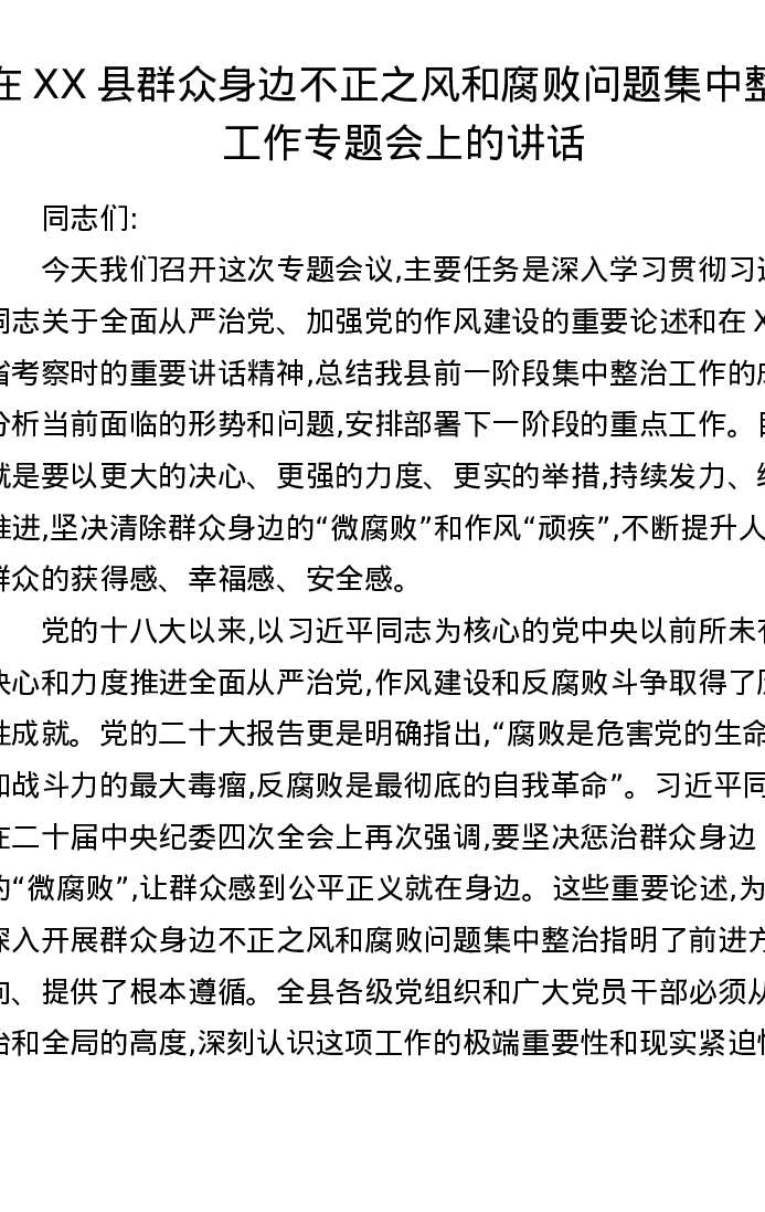 在XX县群众身边不正之风和腐败问题集中整治工作专题会上的讲话