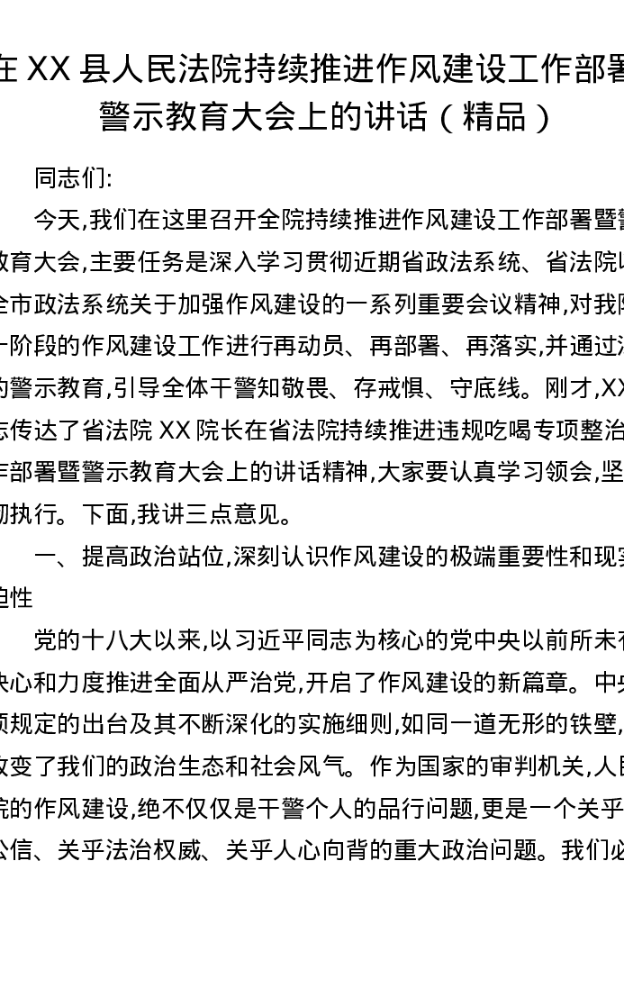 在XX县人民法院持续推进作风建设工作部署暨警示教育大会上的讲话