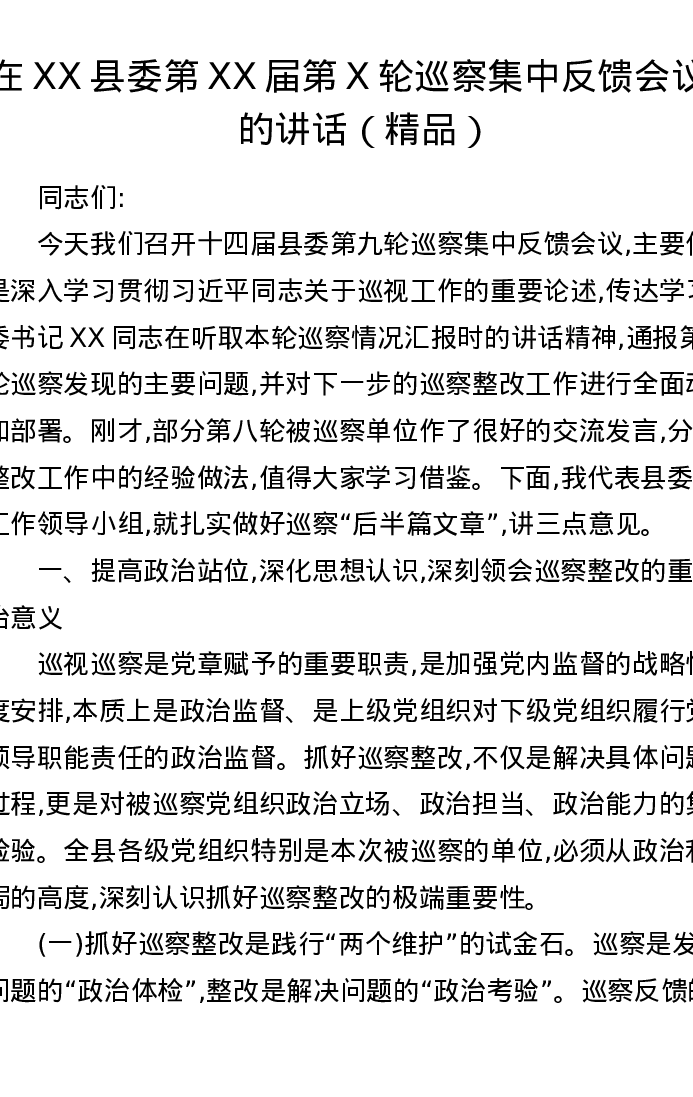 在XX县委第XX届第X轮巡察集中反馈会议上的讲话