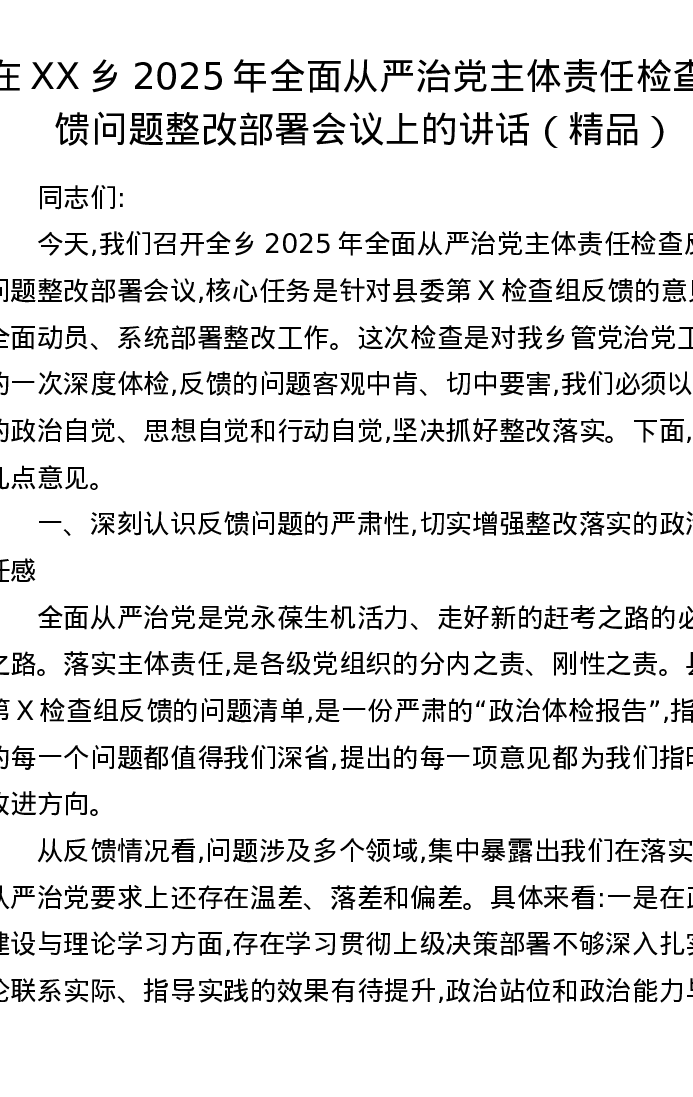 在XX乡2025年全面从严治党主体责任检查反馈问题整改部署会议上的讲话