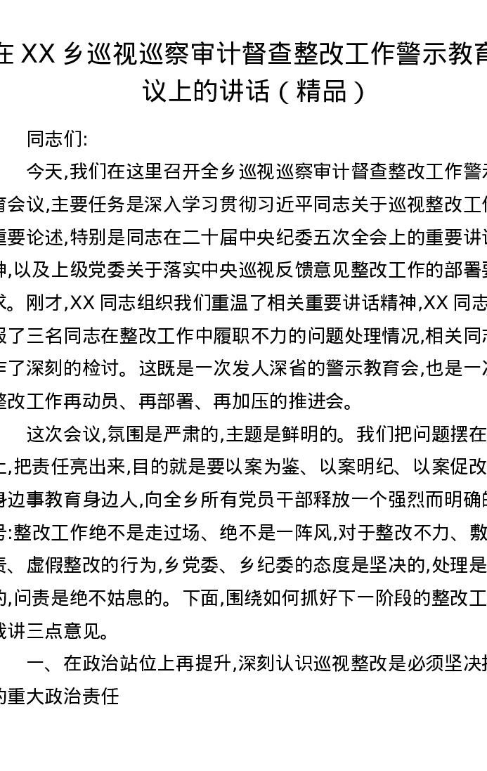 在XX乡巡视巡察审计督查整改工作警示教育会议上的讲话