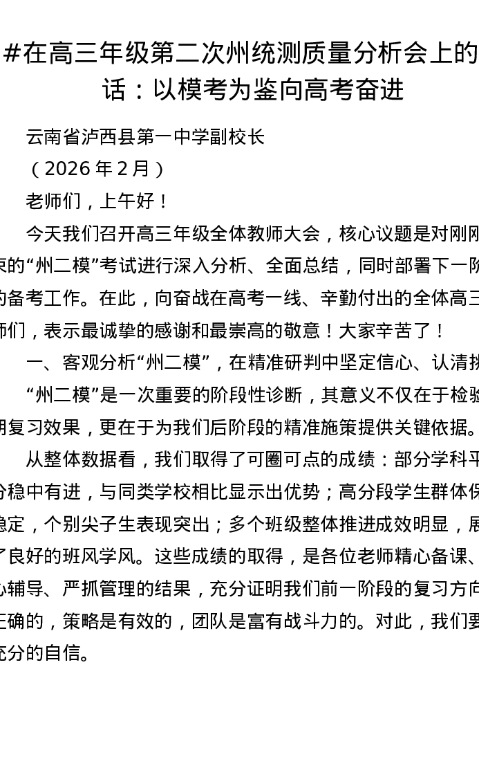 在高三年级第二次州统测质量分析会上的讲话:以模考为鉴向高考奋进