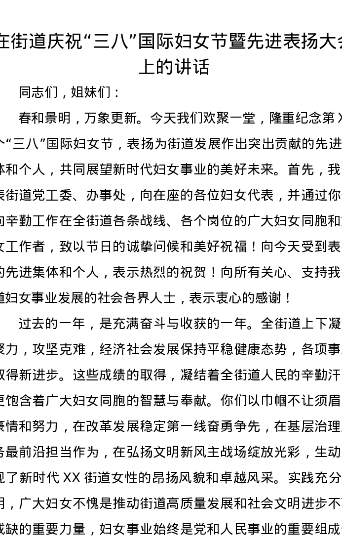 在街道庆祝三八国际妇女节暨先进表扬大会上的讲话