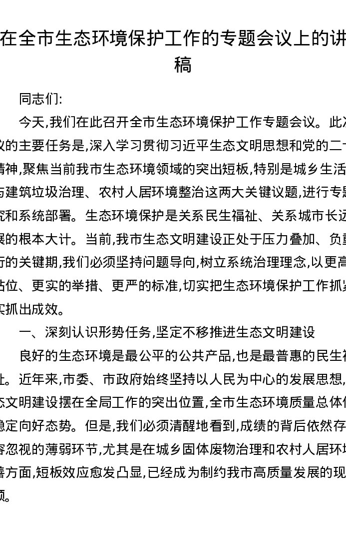在全市生态环境保护工作的专题会议上的讲话稿