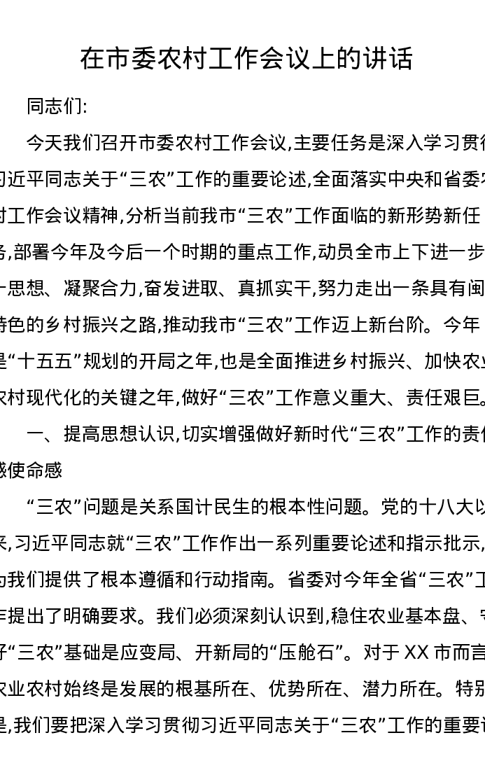 在市委农村工作会议上的讲话