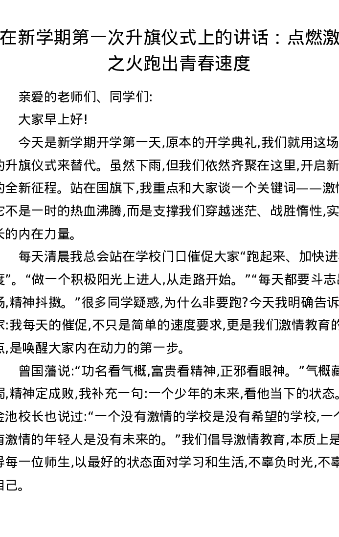在新学期第一次升旗仪式上的讲话:点燃激情之火跑出青春速度