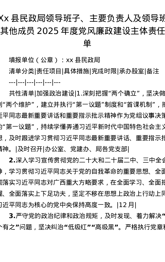 Xx县民政局领导班子、主要负责人及领导班子其他成员2025年度党风廉政建设主体责任清单