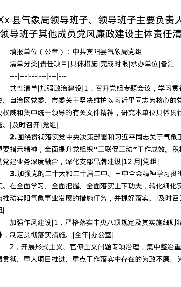 Xx县气象局领导班子、领导班子主要负责人及领导班子其他成员党风廉政建设主体责任清单