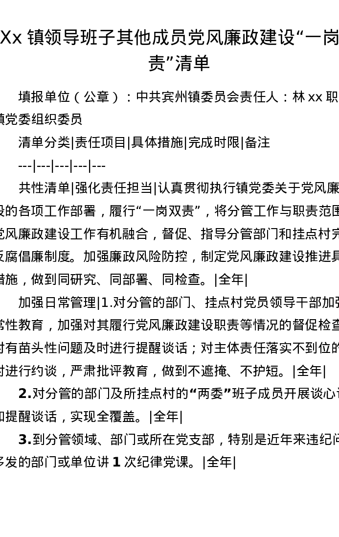 Xx镇领导班子其他成员党风廉政建设一岗双责清单