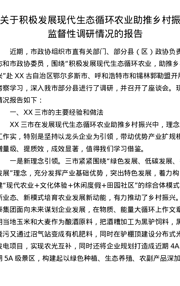 关于积极发展现代生态循环农业助推乡村振兴监督性调研情况的报告