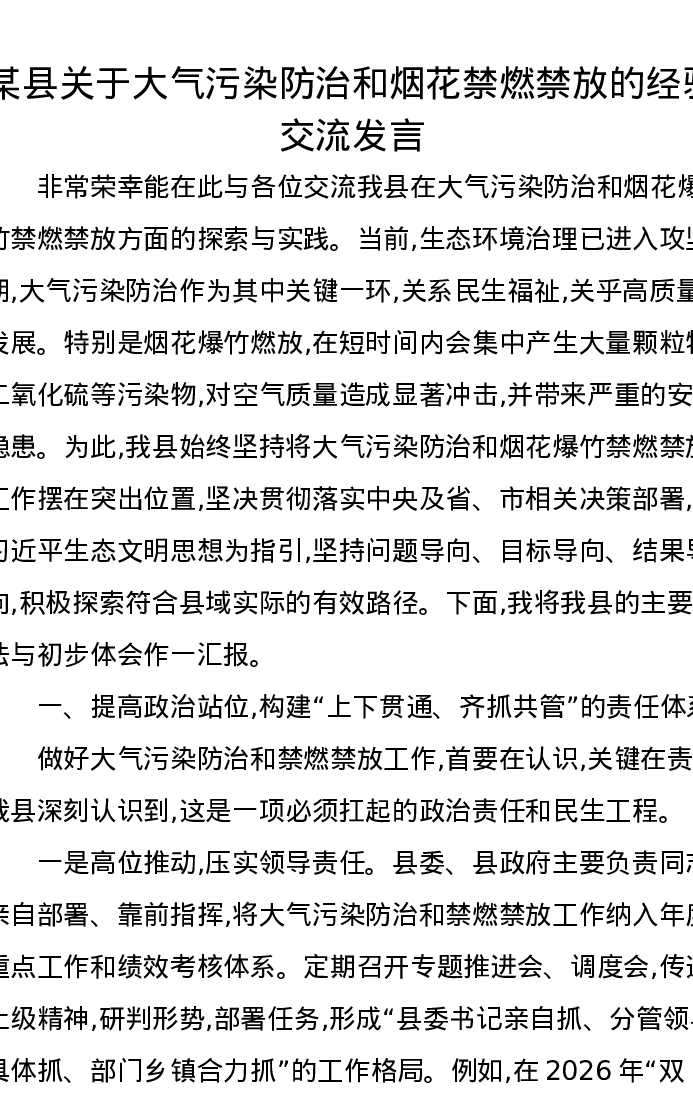 某县关于大气污染防治和烟花禁燃禁放的经验交流发言
