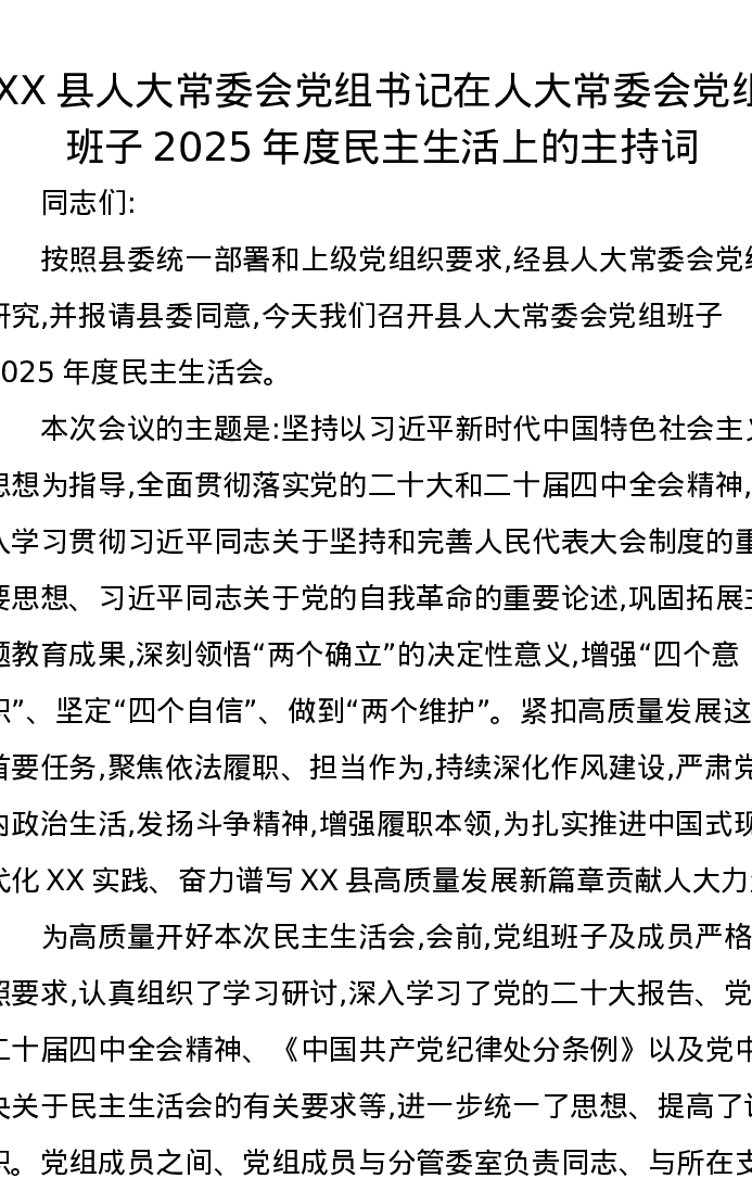XX县人大常委会党组书记在人大常委会党组班子2025年度民主生活上的主持词