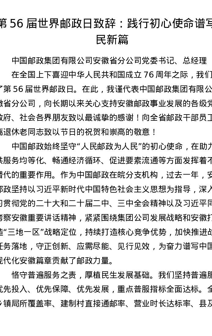 第56届世界邮政日致辞:践行初心使命 谱写为民新篇