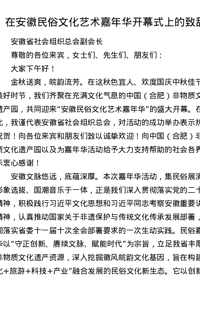 在安徽民俗文化艺术嘉年华开幕式上的致辞