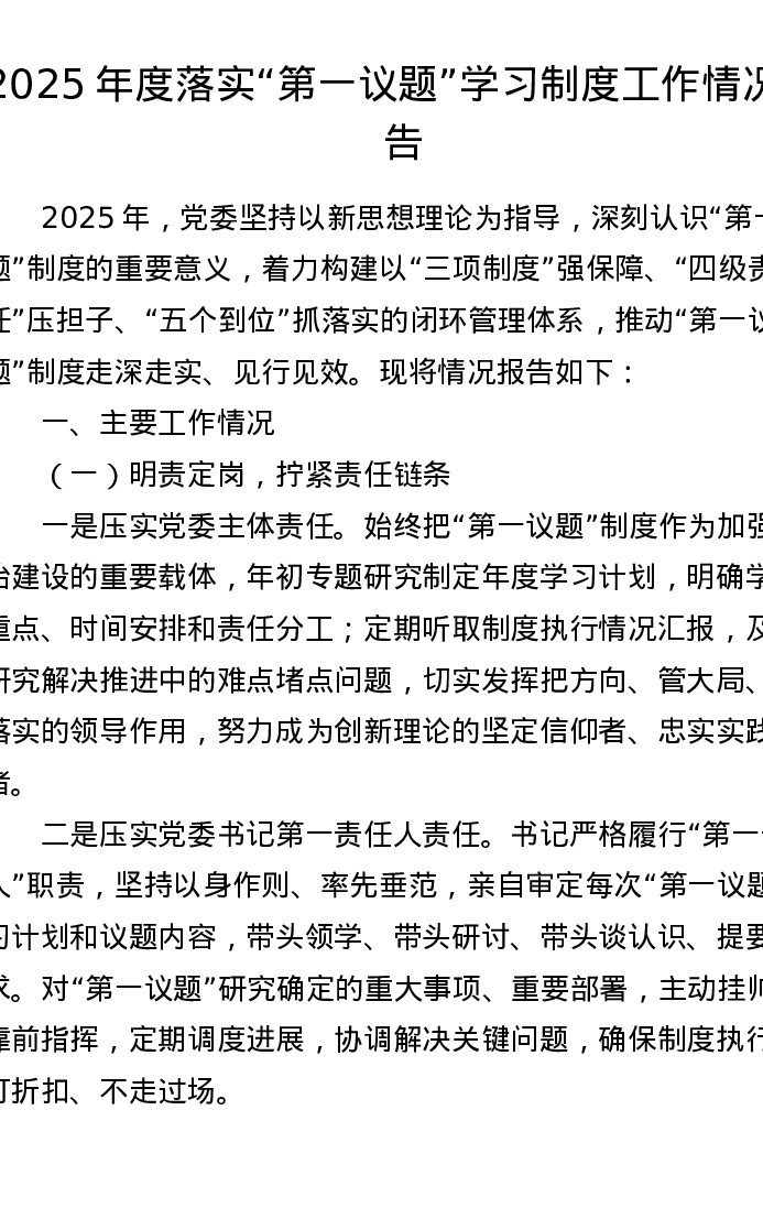 2025年度落实第一议题学习制度工作情况报告