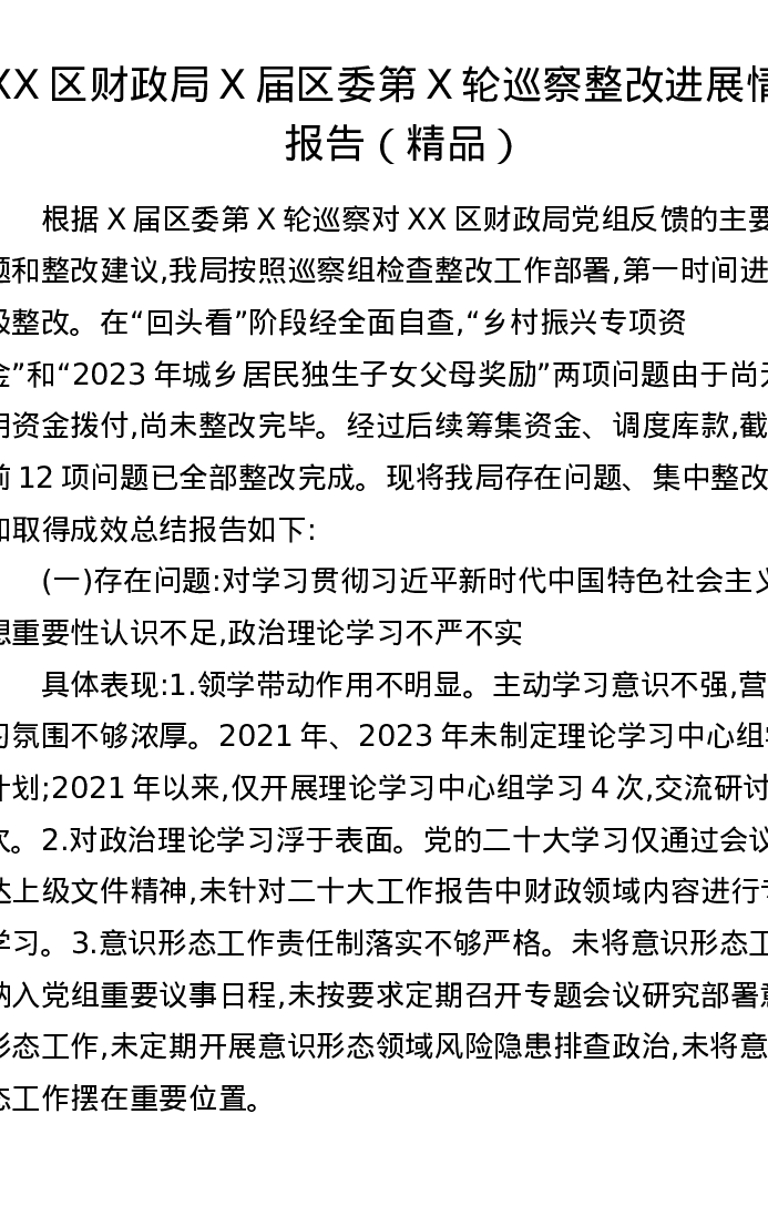 XX区财政局X届区委第X轮巡察整改进展情况报告