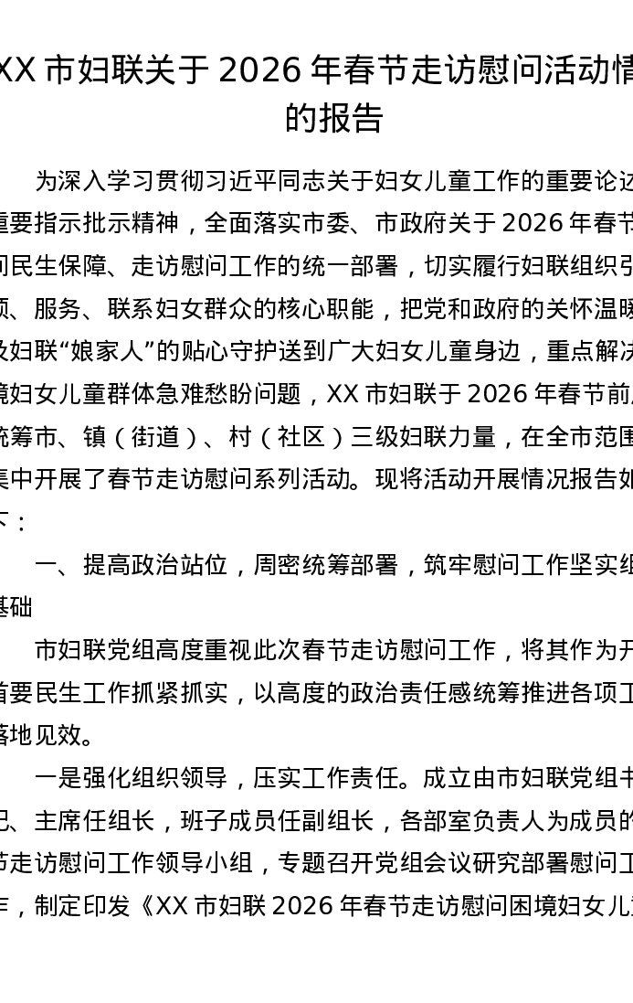 XX市妇联关于2026年春节走访慰问活动情况的报告