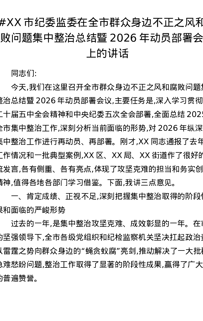 XX市纪委监委在全市群众身边不正之风和腐败问题集中整治总结暨2026年动员部署会议上的讲话
