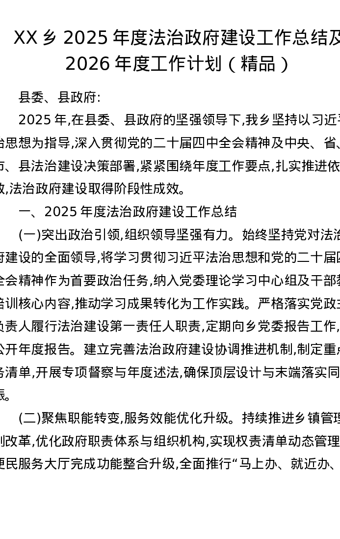 XX乡2025年度法治政府建设工作总结及2026年度工作计划