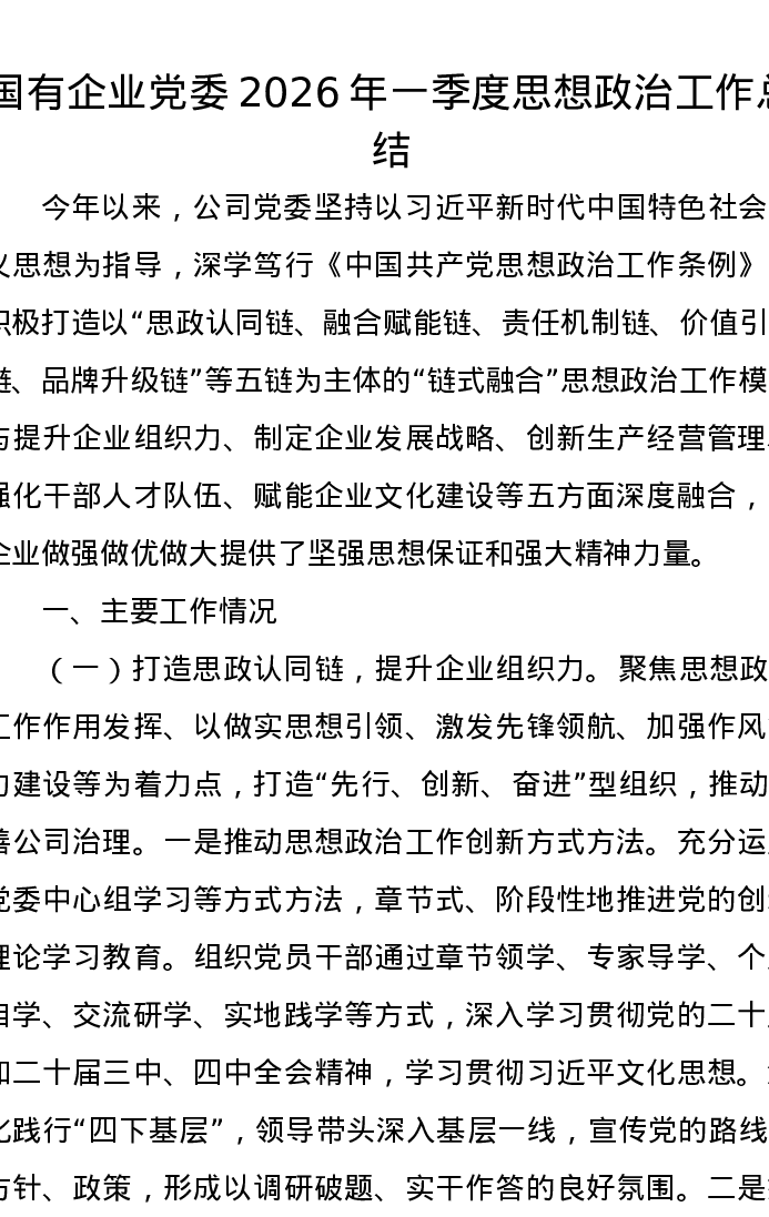 国有企业党委2026年一季度思想政治工作总结