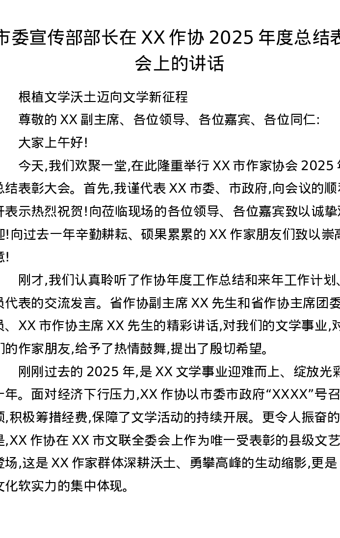 市委宣传部部长在XX作协2025年度总结表彰会上的讲话
