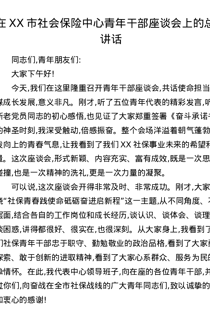 在XX市社会保险中心青年干部座谈会上的总结讲话