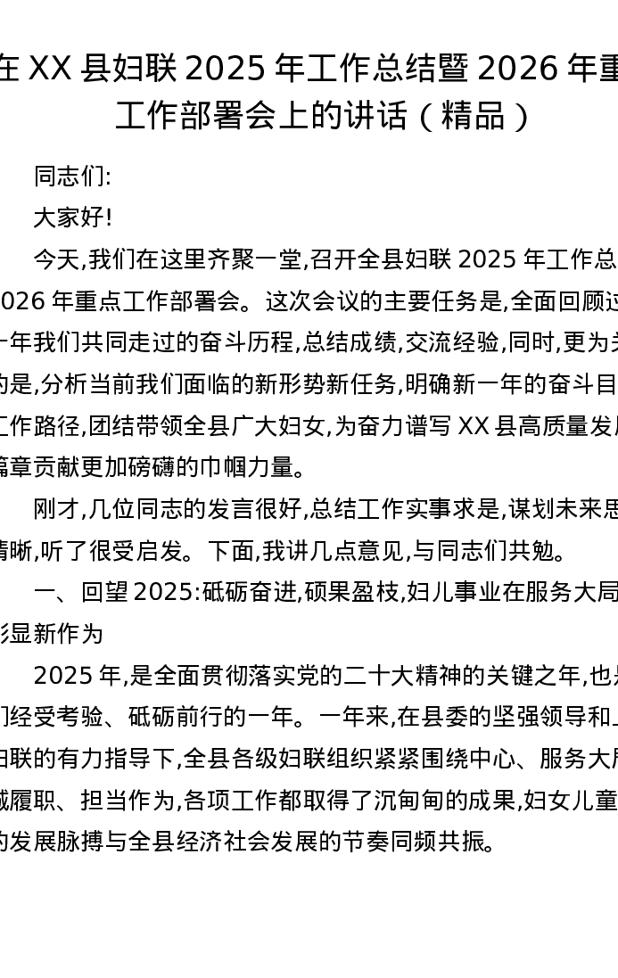 在XX县妇联2025年工作总结暨2026年重点工作部署会上的讲话