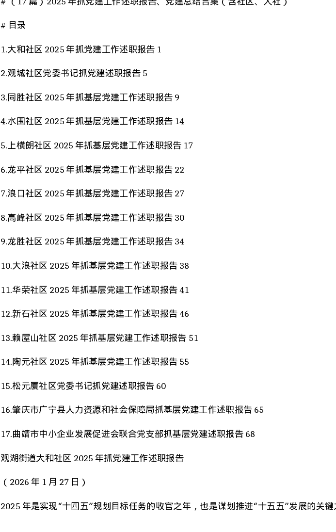汇编:2025年抓党建工作述职报告、党建总结合集(含社区、人社)17篇
