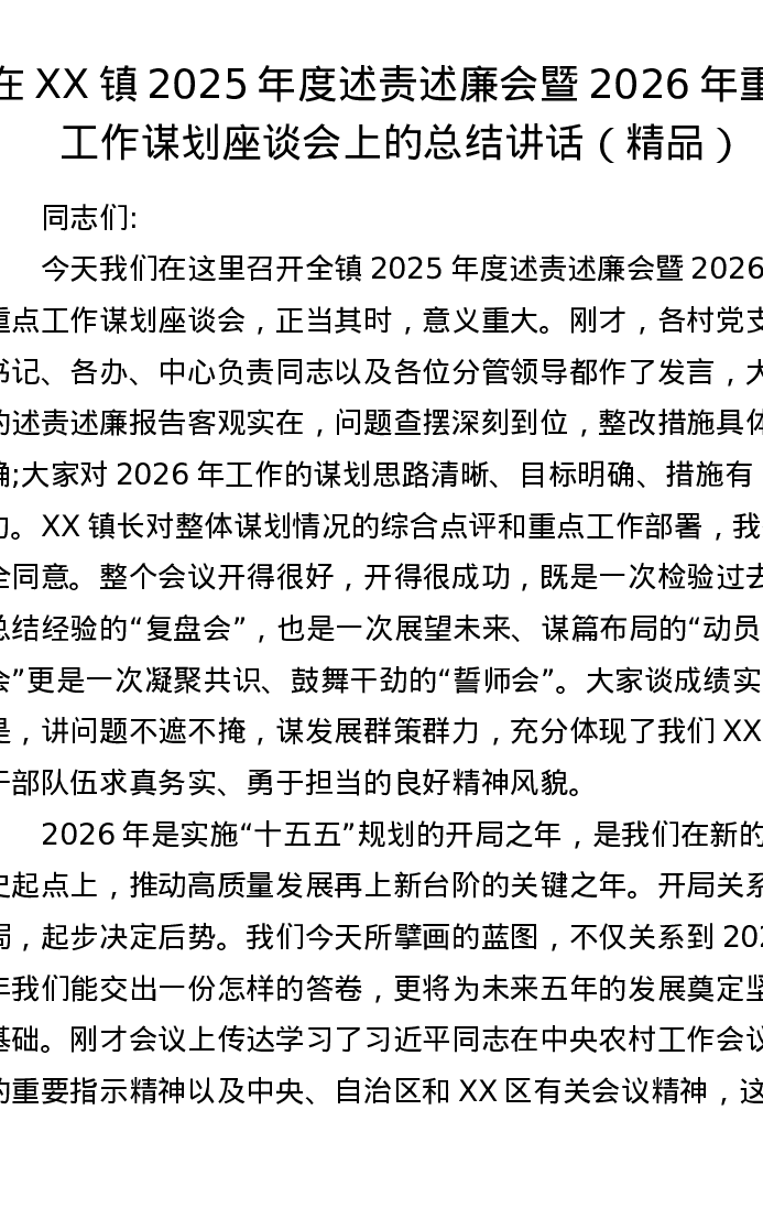 在XX镇2025年度述责述廉会暨2026年重点工作谋划座谈会上的总结讲话