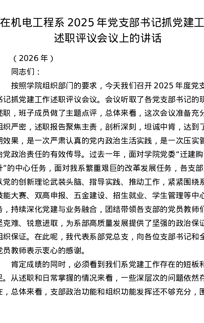 在机电工程系2025年党支部书记抓党建工作述职评议会议上的讲话