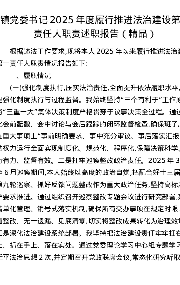镇党委书记2025年度履行推进法治建设第一责任人职责述职报告