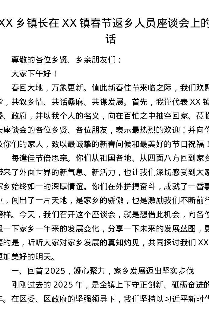 XX乡镇长在XX镇春节返乡人员座谈会上的讲话