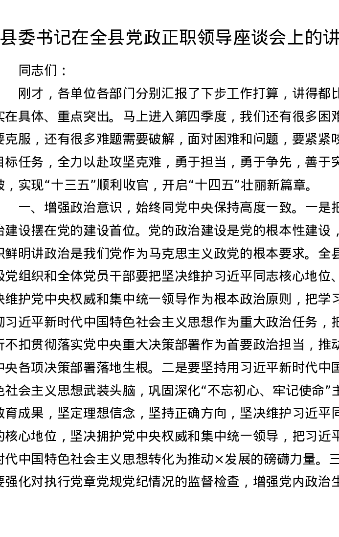 县委书记在全县党政正职领导座谈会上的讲话