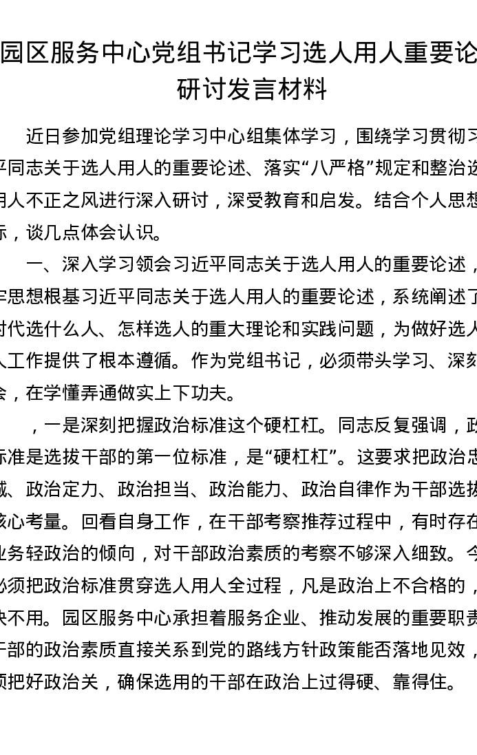 园区服务中心党组书记学习选人用人重要论述研讨发言材料