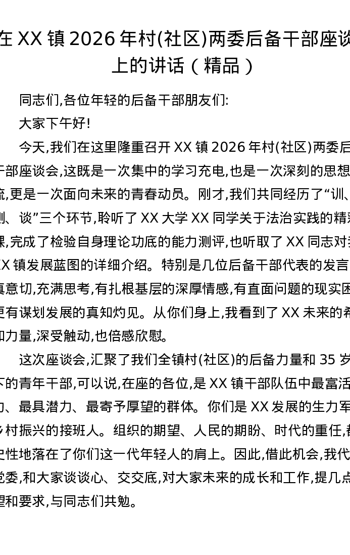 在XX镇2026年村(社区)两委后备干部座谈会上的讲话