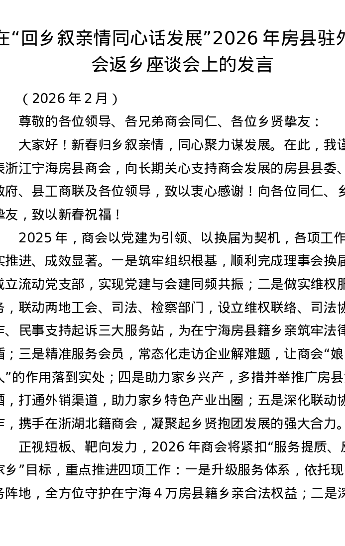 在回乡叙亲情同心话发展2026年房县驻外商会返乡座谈会上的发言